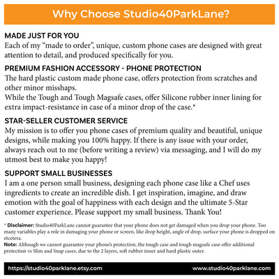 * Disclaimer: Although my phone cases offer impact-resistance protection, Studio40ParkLane cannot be held responsible for damage to your phone case in case of a significant drop. Too many variables play a role, like height and angle of the drop, all of which Studio4ParkLane has no control over.